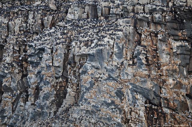A cross section of the bird cliff on Hornøya, Øst-Finnmark, with kittiwakes and guillemots. The first birds arrive in February/March and lay eggs during April/May. We can expect to see the first kittiwake chicks by the end of June. The chicks are fed by both parents for 5 to 6 weeks until they all leave Hornøya at the end of July and August. Thanks to Ole Klaudiussen in Vardø who helped get out to the island, and Rob Barrett at the Tromsø University Museum and SEAPOP for economic support. Read about the trip here. Hornøya is an amazing place: it is the home of 100,000 seabirds, and it is only a 10 minute boat drive from Vardø island. It hosts a wide varitey of bird seabird species. It is this spectacle we aim to bring closer to the people of Vardø and the rest of the world. The web camera project on Hornøya is spearheaded by Biotope and Cloudware - a mix of nature knowledge and computer knowledge. We have developed a web camera set up, that provides high quality and a very decent price. We handle everything from the mounting to the online presentation and operation systems. In short: we have made a system of quality components to easily stream the bird life from cliff to the people. A few photos below from our recent trip to Hornøya. Grand thanks to fisherman Ole Klaudiussen in Vardø, who brought us safely to and from Vardø on a windy march day. The variety of bird species on Hornøya is great ...
