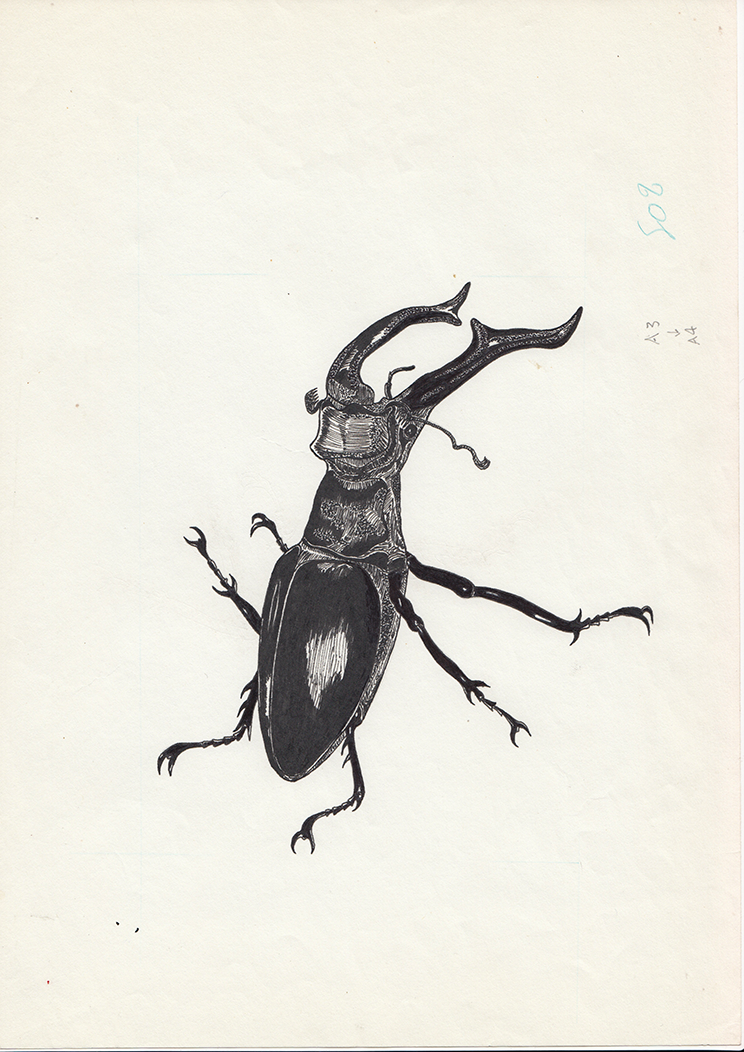 Stag beetle, ink on paper, c. 1980s. Anonymous, from the archive of Stave Hill Ecological Park / Trust for Urban Ecology, archive.org